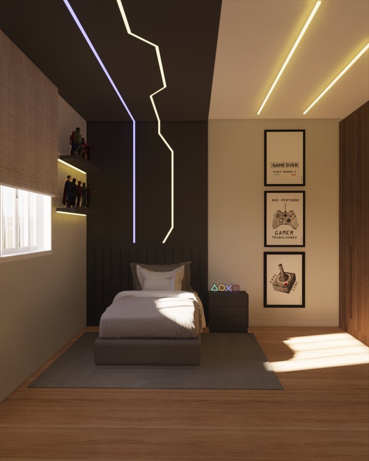 Cores fortes, iluminação indiretas e uma bancada tanto para computador como espaço para estudo. Unir essas diferenças funções foi um desafio para nós, mais conseguimos esse resultado excelente!