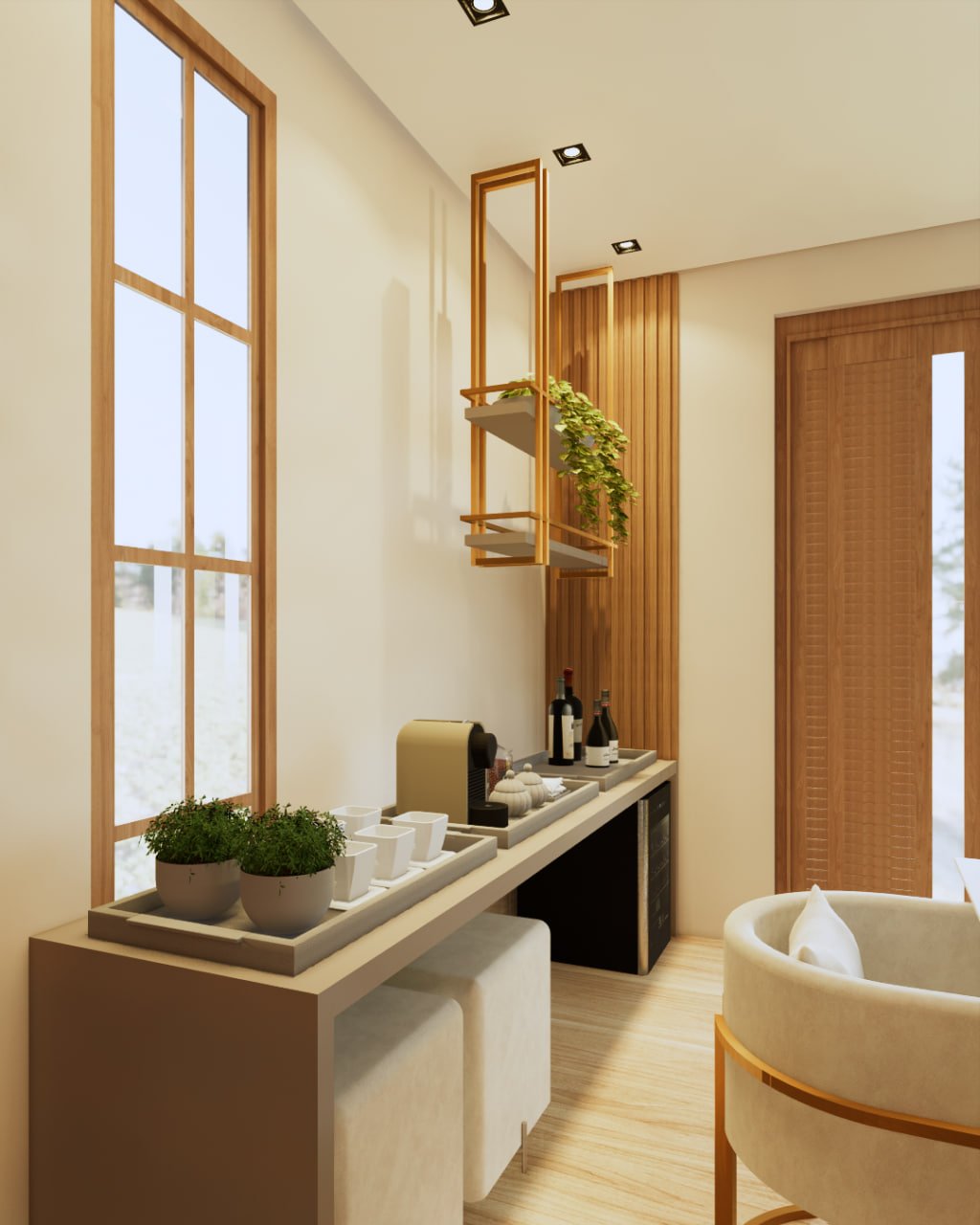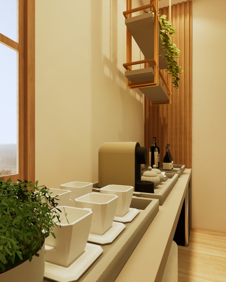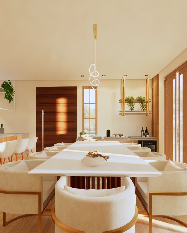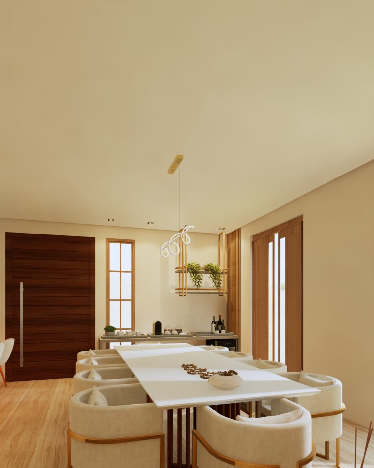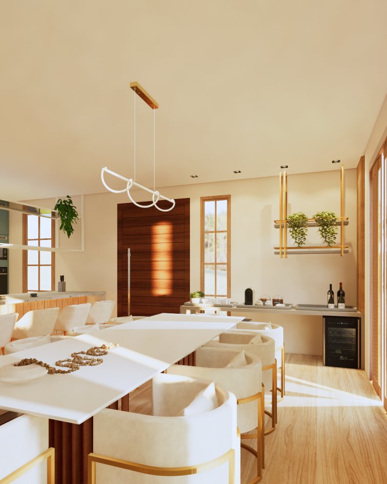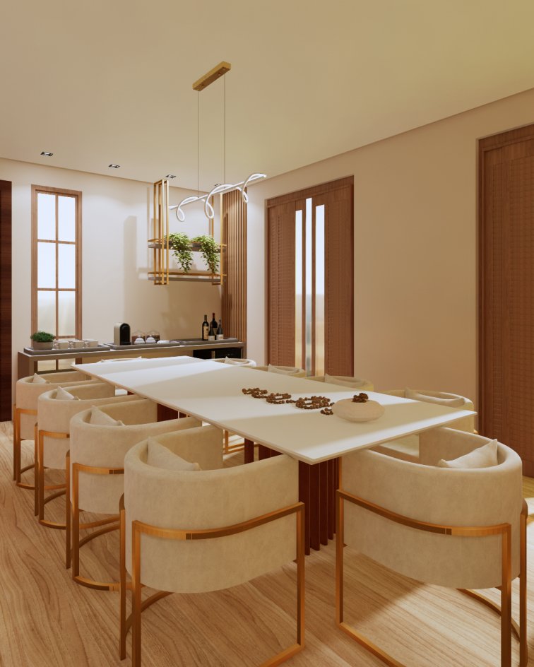 Neste projeto, priorizamos a marcenaria funcional com um aparador, ideal para servir e apoiar durante as refeições. Nosso objetivo foi otimizar o espaço e garantir o máximo de assentos possíveis na mesa. Além disso, atendendo aos desejos dos nossos clientes, incorporamos linhas orgânicas, como os pés curvos, o design das poltronas e a iluminação, que conferiram o toque final.